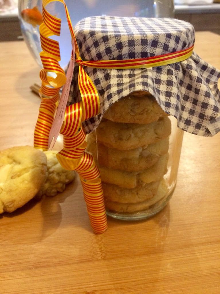 ) que nous avons emballés dans un bocal de cornichons vide et propre. Comme j'avais jeté le bouchon nous avons découpé un torchon pour le remplacer. Une élastique et un bout de ruban "Sang et or" et voilà un magnifique cadeau de Noël pour la Maîtresse de Miss Doudou.