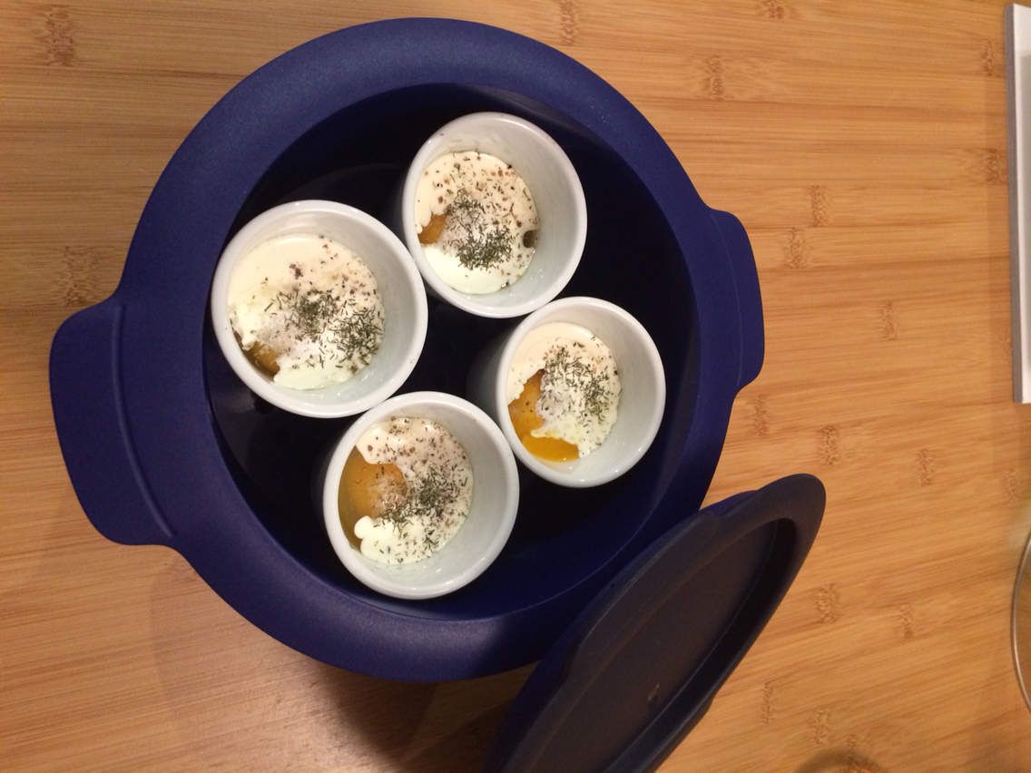Versez 400ml d'eau au fond du Micro Urban, placez le grand panier et mettez y 4 ramequins beurrés. Cassez un œuf dans chaque ramequin, ajoutez 10ml de crème dans les ramequins, sel poivre et aneth.